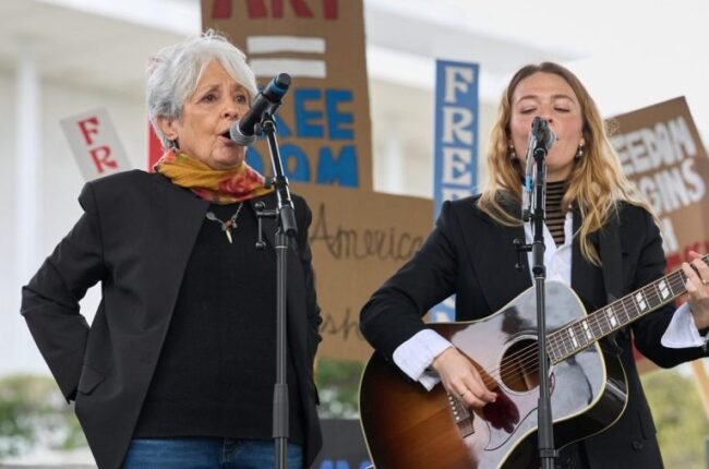 Actress Jane Fonda and singer Joan Baez were among the most notable celebrities at a demonstration of musicians, actors and artists in front of the Kennedy Center building on Friday to denounce what they described…